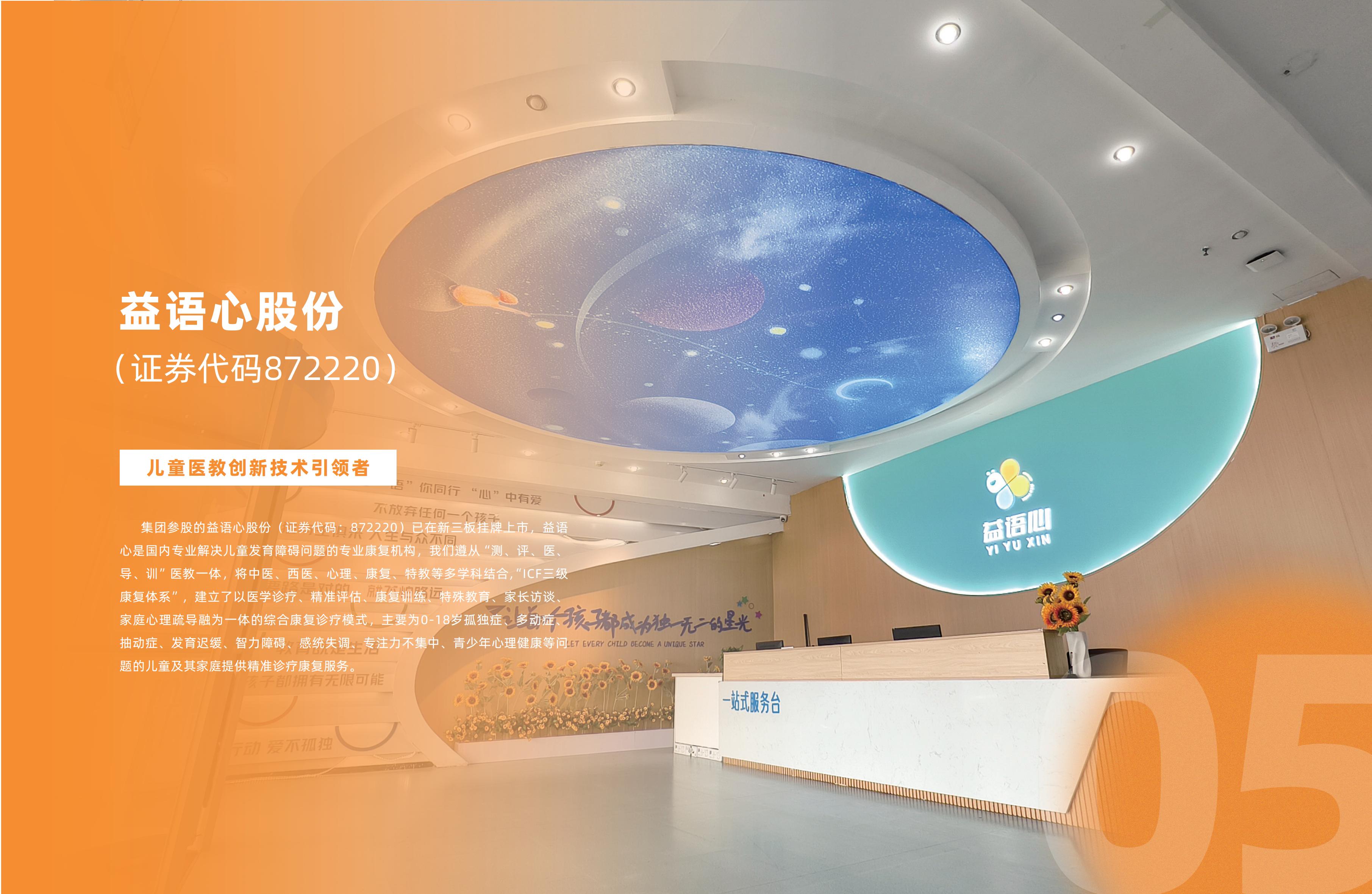 J9旗舰厅控股集團(tuán)有限公司(簡稱“J9旗舰厅控股集團(tuán)”)始建于2017年11月,集團(tuán)總部位于山東泰安,總建筑面積七萬余平,現(xiàn)有員工700余人,是一家集醫(yī)、康、養(yǎng)、產(chǎn)、學(xué)、研于一體的綜合性健康產(chǎn)業(yè)集團(tuán)公司。集團(tuán)下設(shè)成康、醫(yī)康養(yǎng)、醫(yī)療科技、教育等事業(yè)部,通過“立足本土、放眼全球”的戰(zhàn)略布局,構(gòu)建起多維度的心理康復(fù)服務(wù)體系。 集團(tuán)參股的益語心股份(證券代碼:872220)已在新三板掛牌上市,益語心是國內(nèi)專業(yè)解決兒童發(fā)育障礙問題的專業(yè)康復(fù)機(jī)構(gòu),我們遵從“測、評、醫(yī)、導(dǎo)、訓(xùn)”醫(yī)教一體,將中醫(yī)、西醫(yī)、心理、康復(fù)、特教等多學(xué)科結(jié)合,“ICF三級康復(fù)體系”,建立了以醫(yī)學(xué)診療、精準(zhǔn)評估、康復(fù)訓(xùn)練、特殊教育、家長訪談、家庭心理疏導(dǎo)融為一體的綜合康復(fù)診療模式,主要為0-18歲孤獨癥、多動癥、抽動癥、發(fā)育遲緩、智力障礙、感統(tǒng)失調(diào)、專注力不集中、青少年心理健康等問題的兒童及其家庭提供精準(zhǔn)診療康復(fù)服務(wù)。目前業(yè)務(wù)已經(jīng)拓展到浙江、江蘇、廣東等地。